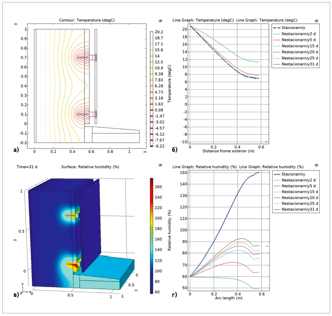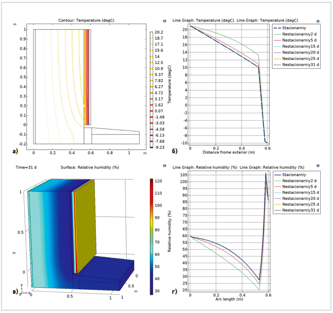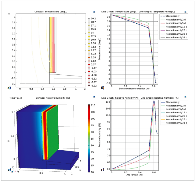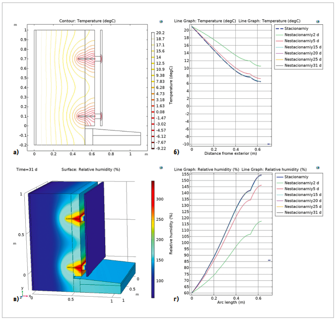 Рис. 3. Характеристики энергозащищённости ограждающей конструкции со штукатурным фасадом с утеплителем «Технофас Проф» (а — изополя изменения температуры в слоях; б — графики изменения температуры по толщине стены; в — изополя изменения влажности в слоях стены; г — графики изменения относительной влажности)