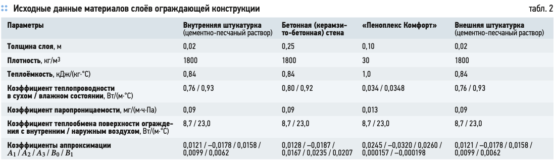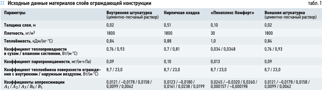 В табл. 1 приведены исходные данные материалов слоёв ограждающей конструкции рассматриваемого здания.