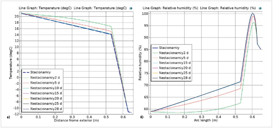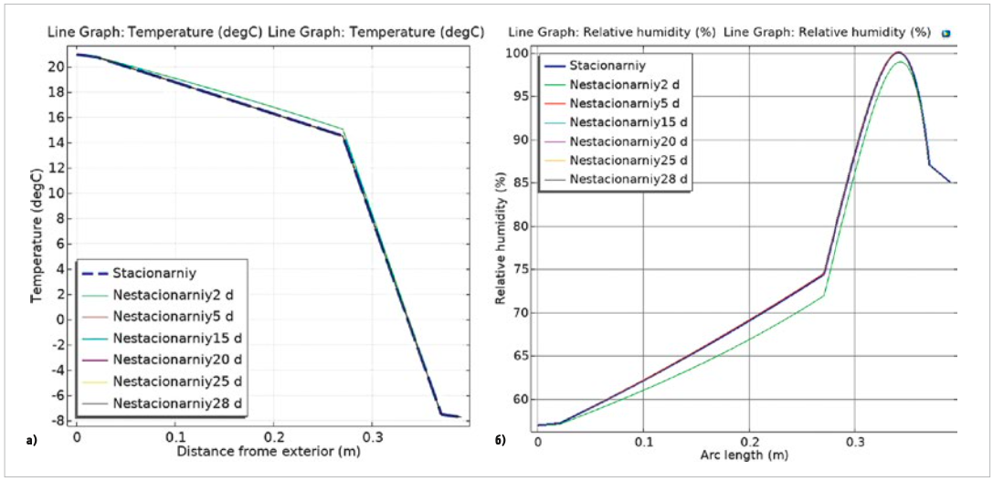 Рис. 4. Распределение температуры и относительной влажности для фрагмента сплошной кирпичной стены (а — графики изменения температуры, б — графики изменения влажности)