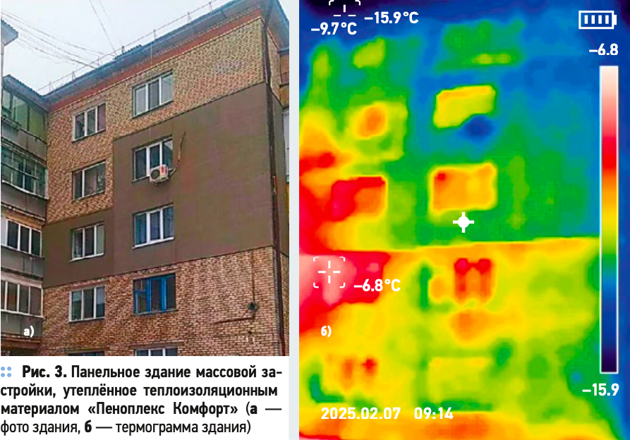 Рис. 1. Кирпичное здание массовой застройки, утеплённое теплоизоляционным материалом «Пеноплекс Комфорт» (а — фото здания, б — термограмма здания)