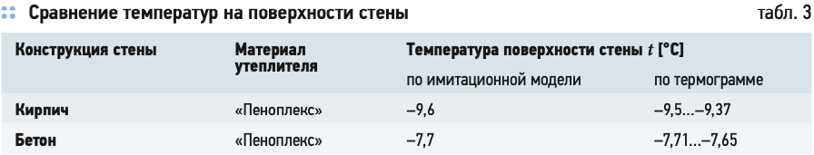 Сравнение температур на поверхности стены, полученных по имитационной модели и с помощью тепловизионной съёмки, представлено в табл. 3.