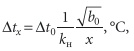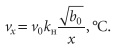 Начальное количество избыточной теплоты струи, истекающей из щели шириной b, равноQ0 = bv0ρcpΔt0, кДж/(м⋅с).где v0 — начальная скорость истечения; ср — удельная теплоемкость воздуха, кДж/(кг⋅°С). Значение Δt0 определяется по формулеΔt0 = tстр – tпом, °С,где tстр, tпом — температура воздуха в струе и помещении соответственно. Удельный секундный конвективный тепловой поток от струи к стене равен: