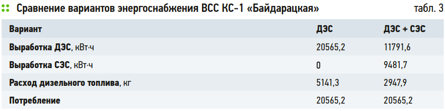 В табл. 1 рассмотрены основные преимущества и недостатки рассматриваемых вариантов. Вариант с использованием дизельного топлива отличается высоким углеродным следом и завязан на внешние поставки дизельного топлива. Вариант ДЭС + СЭС позволяет снизить внешние поставки дизтоплива, однако не позволяет полностью от них отказаться. Варианты СЭС + накопители позволяют рассматривать полностью автономное энергоснабжение ВСС с существенным снижением углеродного следа, однако они более капиталоёмкие и целесообразны только при высоких затратах на дизельное топливо.