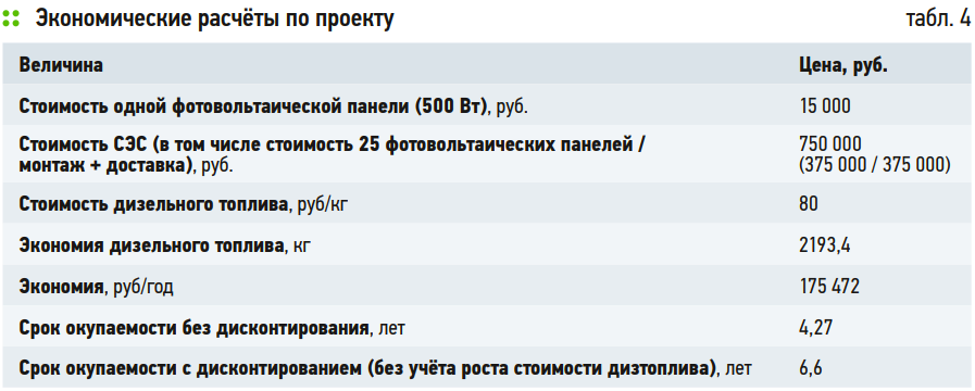 Проведённый в табл. 4 технико-экономический расчёт показывает, что срок окупаемости проекта при принятых в миделе показателях не превышает пяти лет (без учёта дисконтирования и роста стоимости дизельного топлива), а ежегодная экономия за счёт снижения закупок и доставки дизельного топлива составляет 175472 руб. Годовое снижение выбросов парниковых газов в этом случае составляет 6,9 тонн CO2-эквивалента.