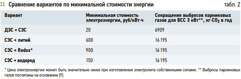 Для выбора оптимального варианта энергоснабжения БССС в качестве критериев взяты минимальная текущая стоимость электроэнергии и сокращение углеродного следа. В табл. 2 дана оценка авторов по минимальной стоимости электроэнергии, при которых варианты становятся экономически целесообразными.