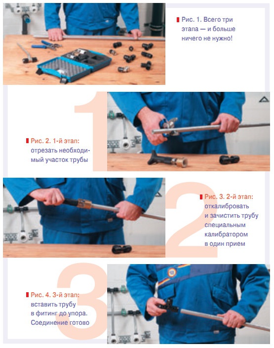 Потребуется резак, калибратор, труба и фитинг. Процесс монтажа выглядит следующим образом: необходимо отрезать трубу требуемой длины, откалибровать ее с помощью насадки калибратора и вставить до упора в фитинг — монтаж закончен. Благодаря тому, что труба и фитинг имеют контрастные цвета (труба — серебристая, фитинг — черный) можно легко проконтролировать глубину вставки даже при плохих световых условиях.