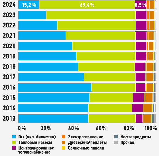В 2013 году 50,8% новостроек были оснащены газовым отоплением, а 32,2% — тепловыми насосами. Ситуация существенно изменилась: к 2024 году 69,4% новых жилых зданий были оснащены тепловыми насосами, а газовым котлами (в том числе работающими на биометане) — только 15,2%.