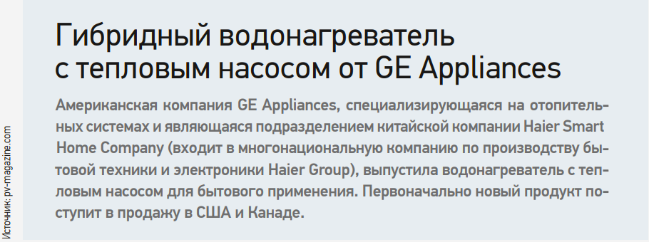 Американская компания GE Appliances, специализирующаяся на отопительных системах и являющаяся подразделением китайской компании Haier Smart Home Company (входит в многонациональную компанию по производству бытовой техники и электроники Haier Group), выпустила водонагреватель с тепловым насосом для бытового применения. Первоначально новый продукт поступит в продажу в США и Канаде.