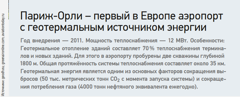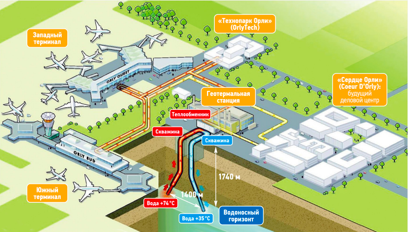 За последние годы несколько аэропортов мира начали использовать возобновляемую энергетику для теплоснабжения, хладоснабжения и выработки горячей воды: «Хитроу» в Лондоне, «Арланда» в Скандинавии, «Шарльде-Голль» в Париже, аэропорты в Бордо, Копенгагене, Франкфурте и др. Но именно Орли принадлежит европейское первенство использования геотермальной энергии из подземного водоносного горизонта, расположенного под территорией аэропорта.
