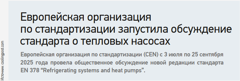 Стандарт EN 378 «Refrigerating systems and heat pumps — Safety and environmental requirements» (в России это ГОСТ EN 378 «Системы холодильные и тепловые насосы. Требования безопасности и охраны окружающей среды») определяет требования безопасности и охраны окружающей среды для холодильных систем и тепловых насосов. Предлагаемые изменения окажут значительное влияние на проектирование и установку как заводских, так и устанавливаемых на месте холодильных, кондиционирующих и тепловых насосных систем.