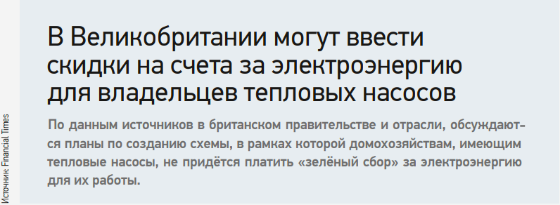 Подавляющее большинство домов в Британии работают на газовых котлах, которые ответственны за более 15% выбросов парниковых газов. Это необходимо изменить, если страна хочет достичь своих целей по сокращению общих выбросов на 81% к 2035 году и достичь нулевого уровня к 2050 году. Активисты долгое время призывали правительство перенести «зелёные сборы» со счетов за электроэнергию на счета за газ или общее налогообложение. Предлагаемая скидка на «чистое тепло» — это попытка сделать тепловые насосы дешевле в эксплуатации, не отменяя сборы полностью. По прогнозам отрасли и правительства, предложение может обойтись в десятки, а то и сотни миллионов долларов в год, и его нужно будет одобрять в рамках обзора государственных расходов.