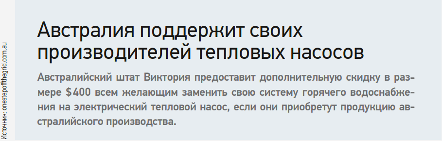 Австралийский штат Виктория предоставит дополнительную скидку в размере $400 всем желающим заменить свою систему горячего водоснабжения на электрический тепловой насос, если они приобретут продукцию австралийского производства.
