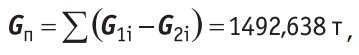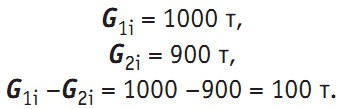 Предположим, что имеется положительный небаланс (т.е. подпитка Gп больше суммы разностей масс на магистралях), который мы распределяем по формуле (1). Пусть в соответствии с формулой (1) на эту магистраль пришлась доля небаланса подпиточной воды, равная 50 т. Следовательно, мы прибавим к имеющимся (измеренным) 100 т дополнительные «балансовые» 50 т, и в итоге получим, что подпитка этой магистрали равна: