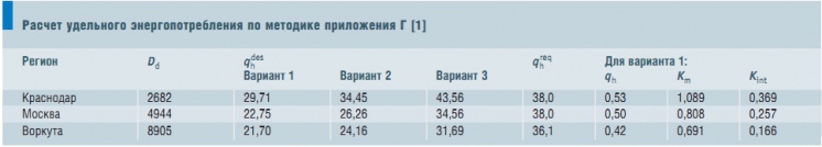 Если провести расчет удельного энергопотребления qhdes, кДж/(м3•°С•сут), по методике приложения Г [1] для характерного здания-представителя — средней школы по типовому проекту 221-1-25-387 [7] — в трех регионах РФ с различными климатическими условиями, а именно в Краснодаре (градусо-сутки отопительного периода Dd = 2682), Москве (Dd = 4944) и Ворку-те (Dd = 8905), получается весьма любопытная картина.