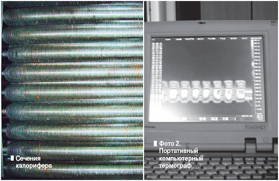 Тепловизионная съемка также позволила предположить нарушения в технологическом процессе цинкования и неплотности примыкания ребер к отдельным трубкам теплообменника. После разборки (распиливания) теплообменника дефект приварки коллекторных перегородок не подтвердился (характер термограммы был обусловлен дефектами окраски и, соответственно, изменением излучающей способности поверхности), дефекты же оребрения и некачественного цинкования были подтверждены.
