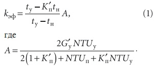 Для этих условий погрешность формул (1)–(3) при изменении Kп и Gу в пределах от 0,5 до 2, что почти всегда соблюдается в реализуемых на практике тепло-утилизационных установках при обычных режимах их эксплуатации, как правило, не превышает 3–4 % [4]. Можно показать, что при отсутствии конденсации водяных паров в тепло-извлекающей секции величина kэф получается несколько завышенной, а требуемый уровень NTU — заниженным по сравнению с точным решением, а при наличии конденсации — наоборот.