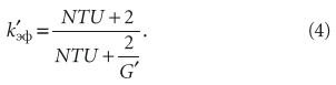 Заметим также, что в пределах толщины линии график для kэф, построенный с использованием формулы (4), совпадает с данными, получающимися исходя из общего соотношения (1) для kэф. Поэтому для оценки изменения температурной эффективности тепло-утилизатора в рассматриваемых условиях существенное значение имеют только параметры NTU и G, а влиянием всех остальных факторов практически можно пренебречь.