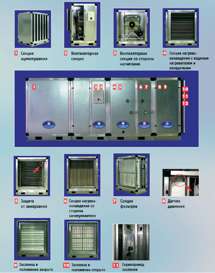Особая компоновка вентиляторной секции позволила значительно уменьшить размеры секции. В центральных кондиционерах предусмотрены фильтровальные секции с карманными фильтрами разной степени очистки. Все необходимые электрические и управляющие подключения осуществлены путем прокладки цепей внутри кондиционера в специальных каналах и вывода их в коммутационный щит, расположенный на корпусе.