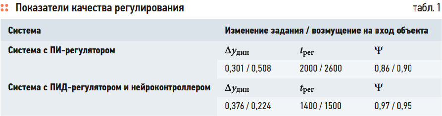 Оценка качества работы рассматриваемых систем регулирования выполняется на основании следующих показателей: динамическое, статическое и максимальное отклонение, время регулирования и степень затухания (табл. 1). На основании расчётов можно сделать вывод о том, что система АСУ в комплекте с ПИД-регулятором и нейроконтроллером эффективнее, чем система с ПИ-регулятором. Это подтверждается сокращённым временем регулирования переходного процесса и значительным снижением динамического отклонения. О преимуществе ПИД-регулятора свидетельствует также повышенный показатель степени затухания, как при изменении входного задания на АСУ, так и при возникновении сигнала возмущения на входе в систему управления.