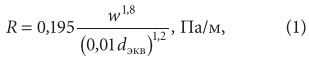 где w — скорость воды в трубопроводе, м/с; dэкв — эквивалентный диаметр воздуховода, мм. Удельная мощность, необходимая для перемещения воздуха через один погонный метр воздуховода, может быть определена по следующей формуле [3]: