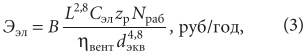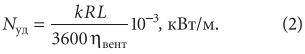 Если теперь выразить скорость воздуха через его расход и диаметр воздуховода и подставить в соотношение для Nуд, получаем формулу для эксплуатационных затрат на электроэнергию для привода вентилятора, отнесенных к одному погонному метру: