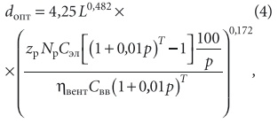 В [1] предлагается использовать на ближайшую перспективу значение р = 10 %.Подставляем соотношения для Квв и Ээл вместо К и Э в (5), вычисляем производную d(СДЗ)/d(d) и приравниваем ее нулю, откуда после некоторых преобразований для оптимального значения d [мм] находим: