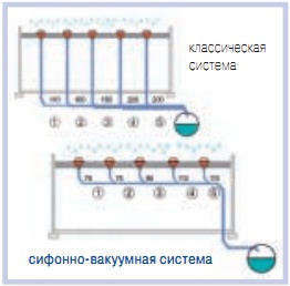 По сравнению с традиционной системой отвода воды, сифонно-вакуумная система является не только экономически выгодной из-за использования меньшего количества стояков, но и ведет к увеличению свободного пространства здания, и соответственно уменьшает количество земляных работ по подключению к основным канализационным линиям. Кроме того, система обладает серьезными техническими преимуществами: в результате полного заполнения трубопровода с помощью специальной конструкции воронок сокращается номинальный диаметр труб.