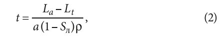 где La — БПК20, поступающей в аэротенк сточной воды, мг/л; Lt — БПК20 очищенной воды, мг/л; a — доза ила, г/л; Sл — зольность ила в долях единицы; ρ — средняя скорость окисления загрязнений в мг БПК20 на 1 г. беззольного вещества ила за 1 ч (по приведённой в СНиПе специальной таблице).