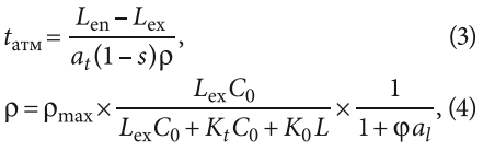здесь Len — БПКполн поступающей в аэротенк сточной воды, мг/л; Lex — БПК20 очищенной воды, мг/л; a — доза ила, г/л; s — зольность ила в долях единицы; ρ — удельная скорость окисления загрязнений в мг БПК20 на 1 г. беззольного вещества ила в 1 ч, определяемая по формуле (4); ρmax — максимальная скорость окисления (по приведённой в СНиПе специальной таблице); C0 — концентрация растворённого кислорода; Kt — константа, характеризующая свойства органических загрязняющих веществ; K0 — константа, характеризующая влияние кислорода [мг О2/л], принимаемая по таблице; ϕ — коэффициент ингибирования продуктами распада активного ила [л/г], принимаемый по таблице.