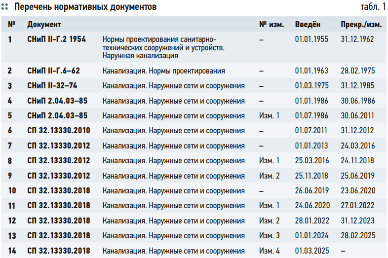 В 2012 году был разработан свод правил (СП) — нормативный документ, который представлял собой актуализированную версию СНиП 2.04.03–85. В 2018-м выпустили новую версию этого свода правил — СП 32.13330.2018, в которую внесли четыре изменения, включая изменения по приказам Минстроя России: от 23 декабря 2019 года №839/пр; от 27 декабря 2021 года №1023/пр; от 28 декабря 2023 года №1009/пр. Следует отметить, что изложение материалов в указанных СП резко отличается от редакции выходивших прежде СНиПов по канализации. Данные своды правил и даже приложения к ним имеют довольно большой объём — от 200 до 300 страниц. Изложение технического материала СП носит повествовательный характер, имеет информационную суть (сущность), но, что самое главное, в нём отсутствуют материалы, позволяющие проводить расчёт сооружений биологической очистки, обеспечивающей удаление соединений азота и фосфора.