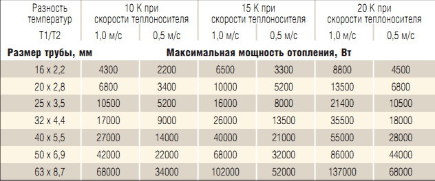 Исходя из максимальной скорости движения теплоносителя при потребной мощности системы отопления (сумма тепловых нагрузок всех отопительных приборов, подключенных к одному стояку) можно определить размер трубы (см. таблицу).