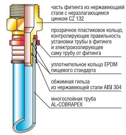Прессовые фитинги имеют также прозрачное кольцо, выполняющее две важные функции. Во-первых, т.к. это пластик, он выполняет функцию изолятора, не допуская контакта алюминиевого слоя трубы и латунного фитинга и предотвращая эффект блуждающих токов.