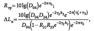 где D и R — локальные коэффициенты прохождения звуковой энергии через стенки (1) и (3) и отражения на их границах; h — толщина слоя; η и γ — коэффициенты потерь в стенке трубопровода и защитного кожуха при наличии на них покрытия; η — коэффициенты потерь в стенке трубопровода без покрытия.