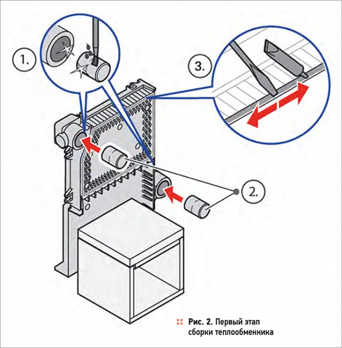 - Установите оставшуюся часть теплообменника так, чтобы было удобно соединить его с новой секцией, причем если теплообменник разобран полностью, то необходимо опереть тыловую секцию о специальную подставку (рис. 2), а в качестве подставки можно использовать, например, деревянную доску.
