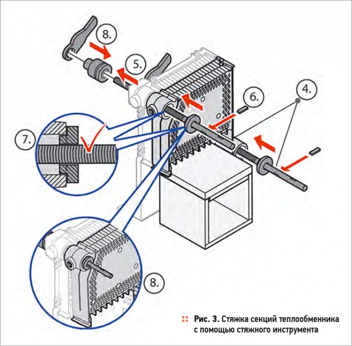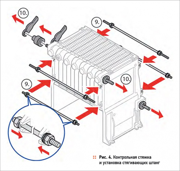 - После сборки всех секций (всего теплообменника) произведите контрольную стяжку стяжным инструментом и установите стягивающие штанги (рис. 4).
