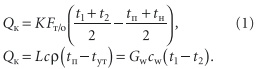 где Fто — поверхность теплообмена воздухонагревателя, м2; Qк — его тепловая мощность, Вт; Gw — массовый расход теплоносителя, т.е., в данном случае, нагретой воды, кг/с; сw — ее удельная теплоемкость, равная 4190 Дж/(кг⋅K); L, c и ρ — объемный расход приточного воздуха [м3/с], его удельная теплоемкость — 1005 Дж/(кг⋅K) и плотность, принимаемая в размере 1,2 кг/м3, соответственно; K — коэффициент теплопередачи теплообменника, Вт/(м2⋅K).