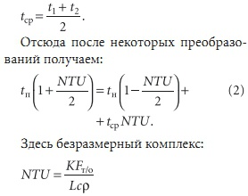 Параметры t1 и t2 представляют собой температуру воды, соответственно, на входе и на выходе из теплообменника, °C; tп и tн — температура приточного воздуха, поступающего в помещение после нагрева в аппарате, и его же температура до подогрева (после теплоутилизатора или, при его отсутствии — наружная).Тогда tср — средняя температура воды в воздухонагревателе: