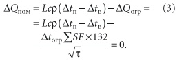 Выражение (3) может быть получено на основе сочетания элементов теории теплоустойчивости и уравнения для распространения температурной волны при однократном тепловом воздействии [2]. Одновременно можно записать выражение для ΔQогр через интенсивность теплообмена между воздухом помещения и поверхностями ограждений:ΔQогр = (Δtв – Δtогр)ΣαF, (5)где α — коэффициент общего теплообмена на поверхностях, его значение можно принять равным ≈ 6,25 Вт/(м2⋅K) [7].