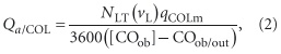 где qCOLg(vL) — выделение угарного газа [г/ч] одним легковым автомобилем, является функцией от скорости легкового транспортного средства vL и дорожного уклона; kh — высотный коэффициент; kcs — коэффициент холодного пуска; ks — коэффициент старения катализаторов; ρCO — плотность угарного газа, г/м3.Минимальный воздушный поток для снижения концентрации угарного газа, выделяемого всеми легковыми автомобилями в тоннеле, м3/с: