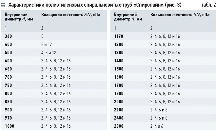 На практике применяются полиэтиленовые трубы, на которые составлены экспертные заключения [3, 4] — двухслойные «Корсис» с кольцевыми жёсткостями SN = 4, 6 и 8 кПа (ТУ 2248-001-730117502005) и 10 кПа (ТУ 2248-001-730117502005 и 2248-031-73011750-2014), а также спиральновитые трубы «Спиролайн» SN = 2, 4, 6, 8, 12 и 16 кПа (рис. 3, табл. 2).