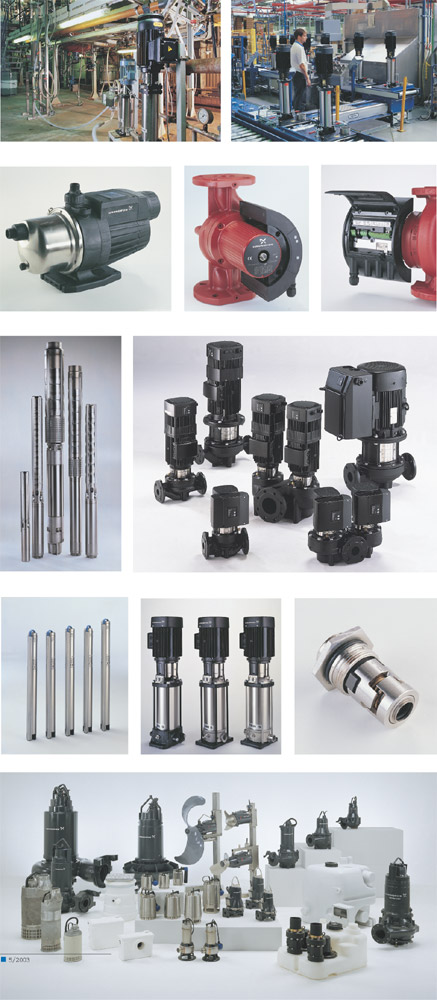 Циркуляционные насосы используются для отопления, вентиляции и кондиционирования воздуха в жилых помещениях, офисах, гостиницах и т.д. В промышленности насосы применяют в различных технологических процессах, системе жизнеобеспечения производства, а также используют как важные встроенные компоненты комплектного оборудования (OEM). Компания Grundfos предлагает широкий спектр высококачественных насосных систем для использования в целях ирригации, установки в теплицах, а также для муниципального, частного и промышленного водоснабжения и канализации. Представительства Grundfos находятся по всему миру. В 1989 году акционерное общество Grundfos, как первый в мире производитель насосного оборудования, получило сертификат качества согласно стандарту ISO 9001. В 1991 году компания Grundfos GmbH (Германия) получила сертификат качества того же стандарта, и в последующие годы остальные подразделения Grundfos также прошли сертификацию.