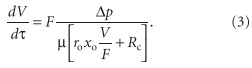 где V — объем фильтрата; F — поверхность фильтрования; τ — продолжительность фильтрования. Основной характеристикой процесса является скорость фильтрования — объем фильтрата, получаемый за единицу времени с единицы поверхности фильтра. Скорость фильтрования прямо пропорциональна разности давлений Δp, обратно пропорциональна вязкости фильтрата m и сопротивлению фильтрующей среды, т.е. сумме сопротивлений слоя осадка Ro и фильтрующей системы Rc.