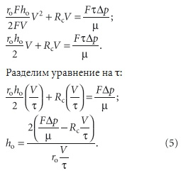 Это уравнение используется для расчета производительности фильтра заданной поверхности или наоборот — необходимой поверхности по заданной производительности. Значения величин ro и Rc определяются экспериментально. Методику расчетов этих констант фильтрования будет подробно изложена в одном из следующих номеров нашего журнала. На практике используются два основных режима фильтрования — постоянного перепада давления и постоянной скорости фильтрования. В данном случае имеет место режим постоянного перепада давления, обеспечивающийся постоянным перепадом высот (Δp = ρgΔh). После разделения переменных и интегрирования от 0 до V и от 0 до τ основное уравнение фильтрования выглядит так: