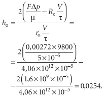 В полученном уравнении V/τ — это предельная скорость, при которой фильтрование можно считать невыгодным. В качестве такой минимальной скорости принимаем капельный режим, т.е. V/τ = 10 мл/с = 10–5 м3/с.Теперь подставим в уравнение (5) исходные данные и найдем, что максимально допустимая расчетная высота осадка равна 0,0254 м или 2,54 см (интересно, что получился ровно 1ʺ) приF = 0,00272 м2, Δp = 9800 Па,m = 5 × 10–5 Па⋅с, Rc = 1,6 × 109 м–1,ro = 4,06 × 1012 м–1: