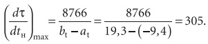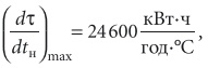 Укажем на этой оси расчетные температуры наружного воздуха tнрх = –26 °С, tнрт + Δtпр = 25 °С, конечную температуру нагрева tк = 10 °C и конечную температуру охлаждения tк1 = 13 °C. Кроме этого, нанесем на этой оси точки с температурами tн = at = –9,4 °С и tн = bt = 19,3 °С. Вычислим максимальную плотность повторяемости этого распределения [ч/(год⋅°C)]: