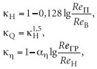 где n — число оборотов ротора насоса; D2 — наружный диаметр лопаток рабочего колеса. Пересчет характеристик насоса необходим в том случае, когда Re не превышает величину переходного числа Рейнольдса ReП = 316000nS–0,305, где nS — коэффициент быстроходности насоса. Для вычисления коэффициентов пересчета напора, подачи и КПД с воды на вязкую жидкость используются следующие соотношения: