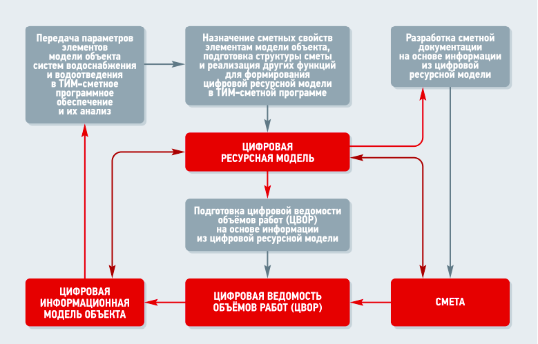 Технологии информационного моделирования позволяют обеспечить взаимосвязь между цифровой информационной моделью объекта систем водоснабжения и водоотведения, цифровой ресурсной моделью, цифровой ведомостью объёмов работ и сметой. В результате формируется эффективный механизм оптимизации проектных решений, который позволяет улучшить проектные решения строительства новых, технического перевооружения и реконструкции существующих объектов систем ВКХ.