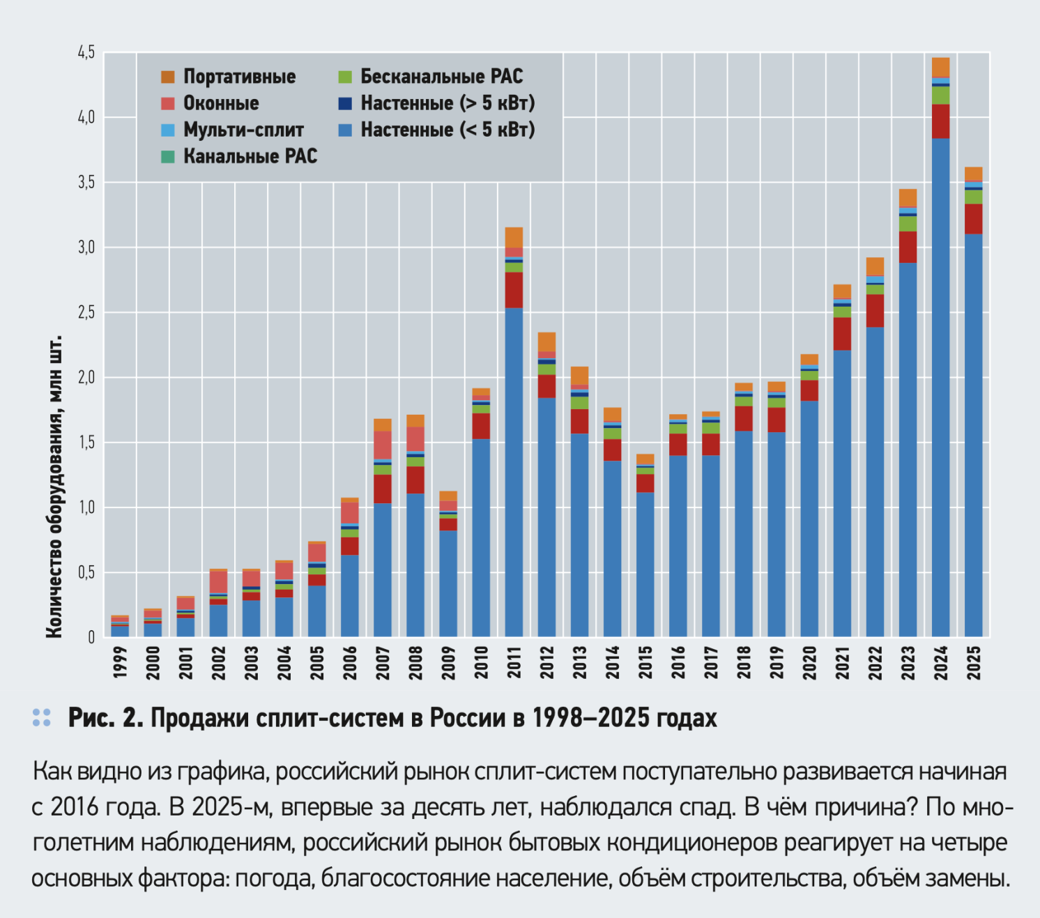 Рынок сплит-систем в России развивается поступательно с 2016 года, и до 2024-го эта поступательность выглядела как почти гарантированный рост. В 2024 году продажи достигли рекордной величины — порядка 4,22 млн сплит-систем.
