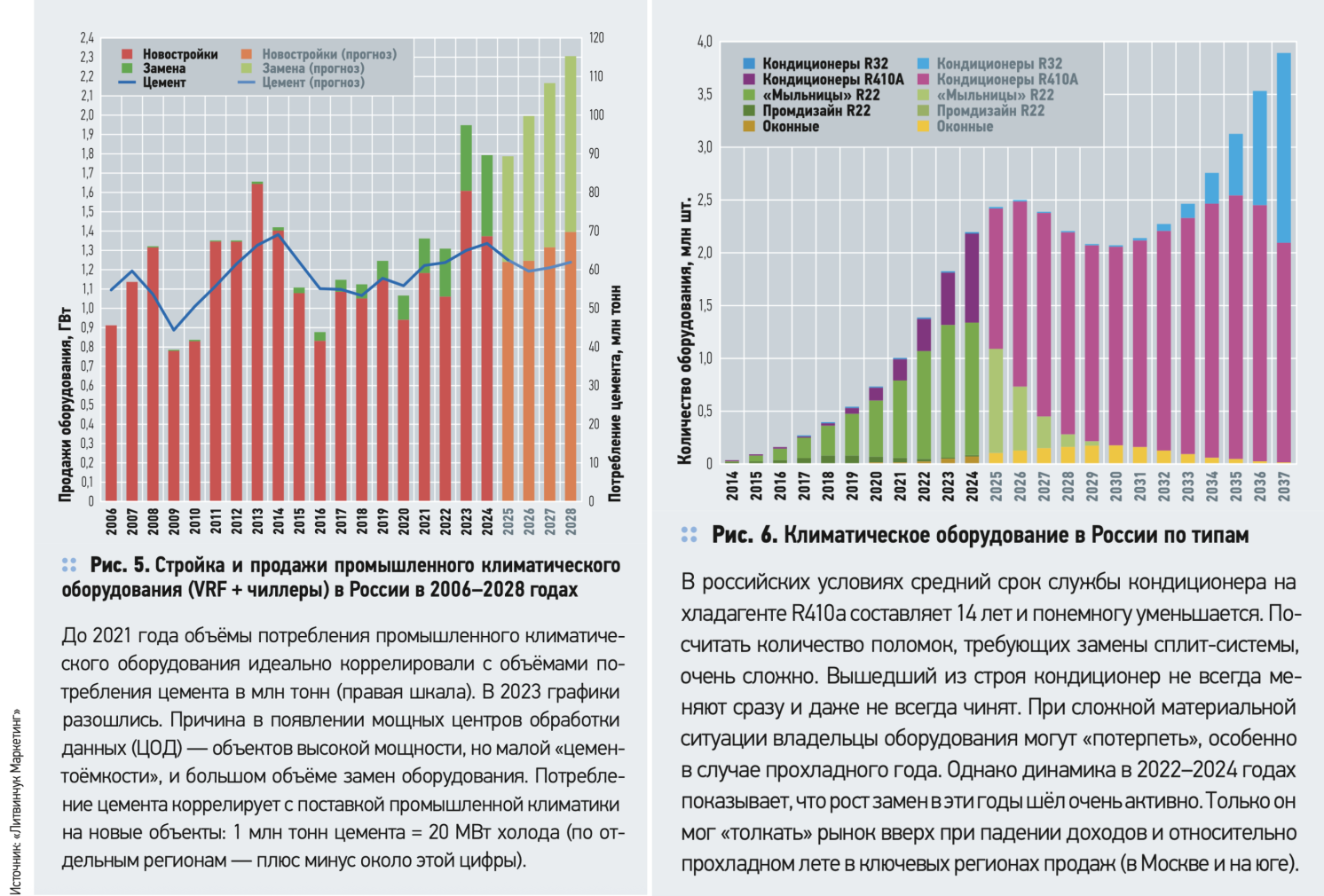 До 2021 года российский рынок промышленной климатики демонстрировал почти идеальную корреляцию с потреблением цемента — классическим индикатором активности в строительстве. Исторически сложившаяся пропорция составляла примерно один миллион тонн цемента на 20 МВт установленной холодильной мощности, и эта зависимость работала предсказуемо по большинству регионов. Однако в 2023 году графики разошлись: объём поставок промышленного HVAC-оборудования продолжил расти, несмотря на снижение потребления цемента. Причина сдвига — появление нового драйвера: массовый ввод мощных центров обработки данных (ЦОД) для искусственного интеллекта и криптомайнинговых ферм, где на относительно небольшую площадь и минимальный объём стройматериалов приходится значительная холодильная нагрузка, измеряемая десятками мегаватт. Именно ЦОД и майнинг-операции требуют постоянного, мощного и надёжного охлаждения независимо от сезона и погоды — спрос неэластичен и не подвержен погодным колебаниям. Развитие этого сегмента будет существенно влиять на развитие отрасли в ближайшие годы. Параллельно растёт второй драйвер — волна замены установленной базы*.