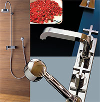 Хрустальные аппликации создают «драматическую красоту». К прохладным зеленоватым хрустальным ручкам добавились новые теплые тона янтаря. Напольные высокие смесители и изливы тоже признак особого статуса, они превосходно смотрятся. Производитель смесителей — фирма Kludi представляет свой последний изыск на эту тему: минималистская форма — перевернутая буква J — подчеркивает солидный облик. Массивная латунь с хромовым покрытием и толщиной в человеческую руку. Высокий излив для ванны сразу обращает на себя внимание. Овальный аэратор обеспечивает цельную струю, а оптимально смонтированный излив бесшумно направляет ее точно в центр ванны — слышен лишь звучный плеск воды.